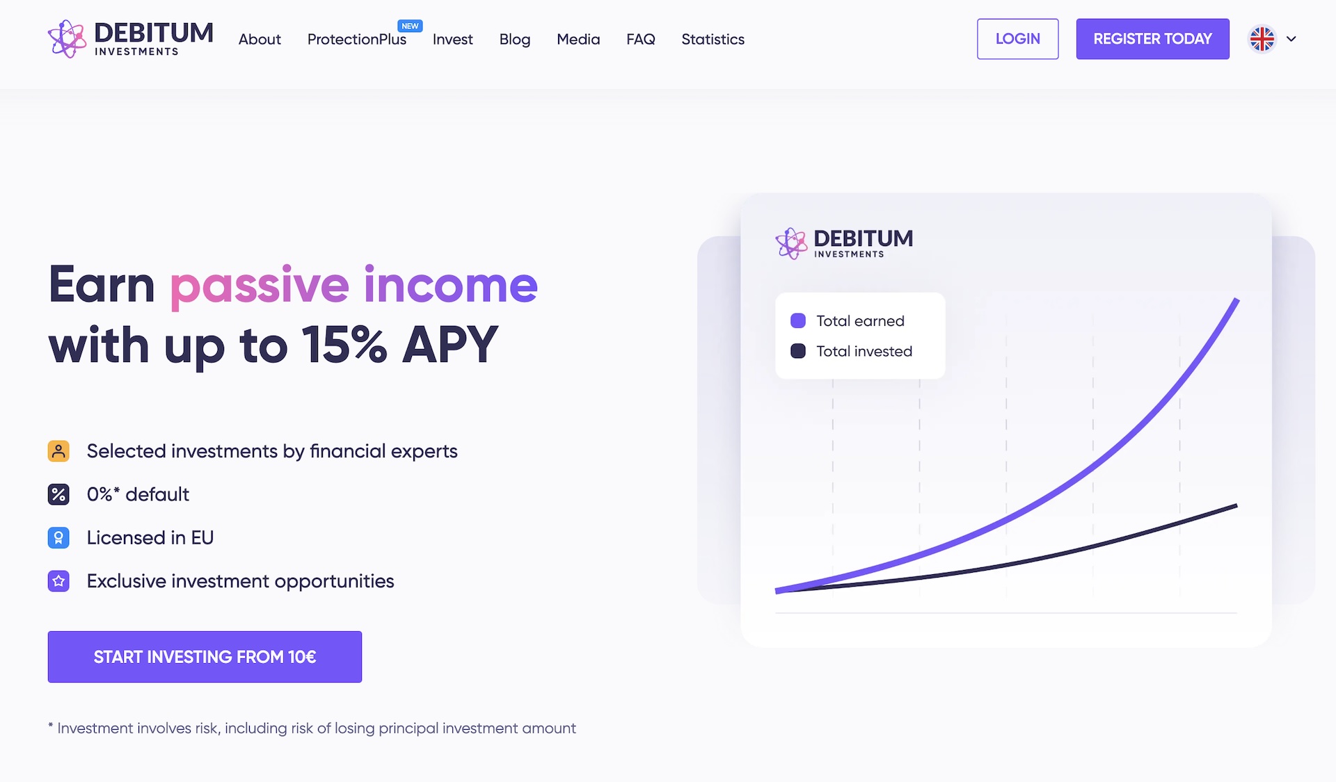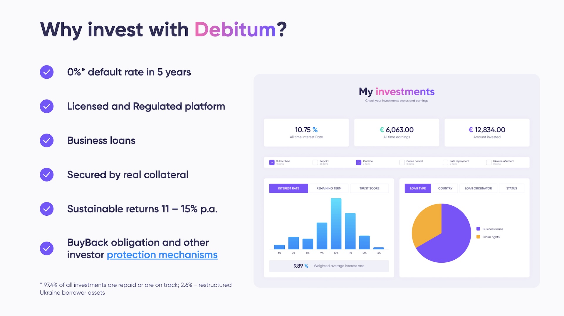 Debitum is a solid, licensed P2P lending platform that stands out by focusing exclusively on business loans, offering more stability than consumer loan platforms. With returns around 9-10%, a 90-day buyback guarantee, and strong regulatory compliance, it's a reliable choice for passive income investors seeking safety over maximum yields.