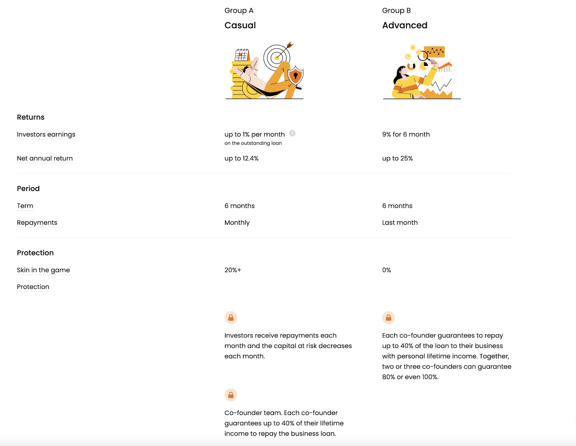 Group B (Advanced Investors): For those willing to take on a bit more risk for higher rewards, Group B offers returns of up to 25% over a 6-month period. This option is tailored for investors looking to maximize their earnings potential. Both loan options are short-term, lasting 6 months, with Group A offering monthly repayments that help reduce the risk of failure by decreasing the capital at risk each month. Group B investors receive their repayments at the end of the term.