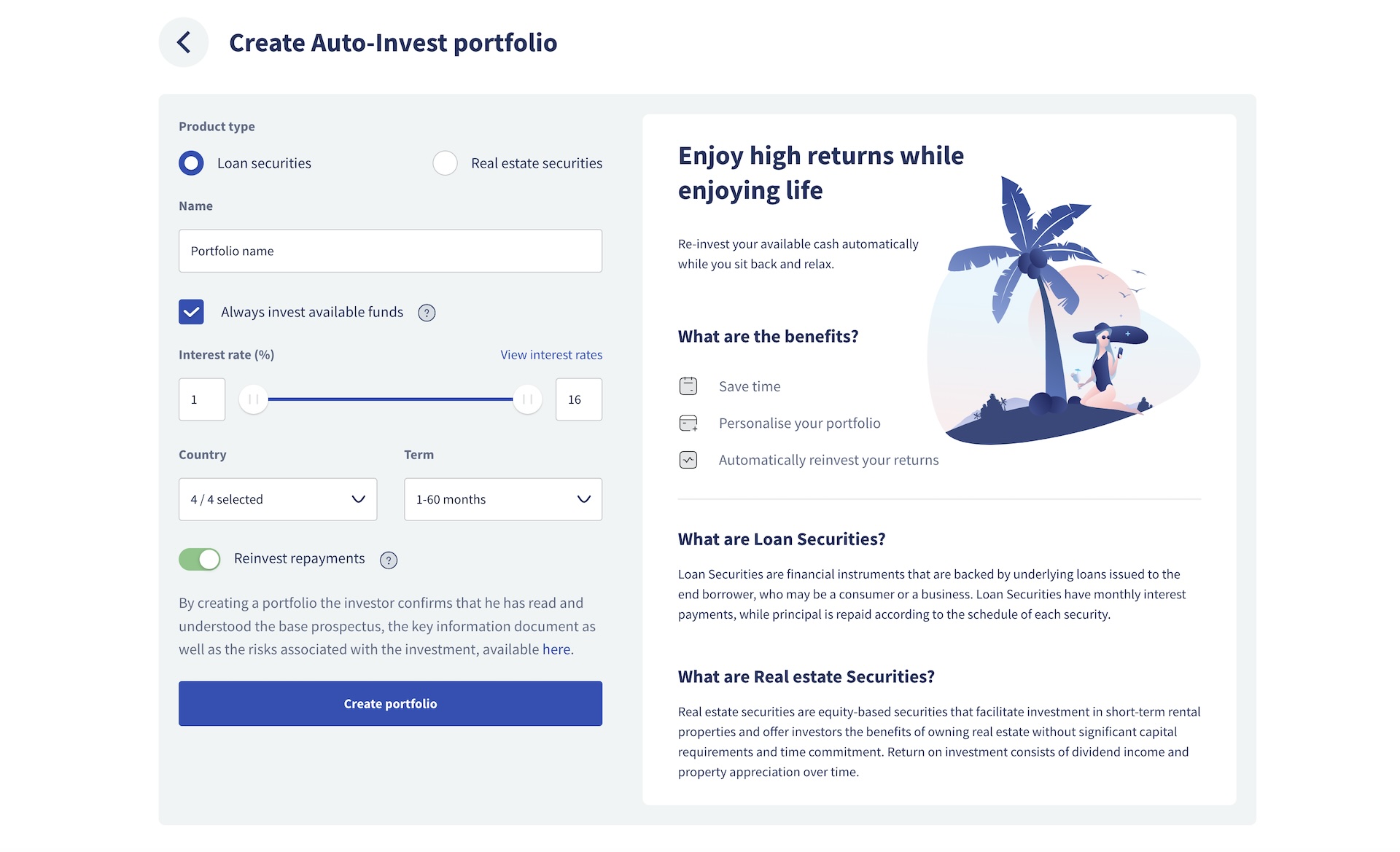 They currently propose loans from 5 different countries, and of 3 different types (consumer loans, business loans, and invoices financing), meaning that investors can diversify their investments in several countries, and also several loan types.