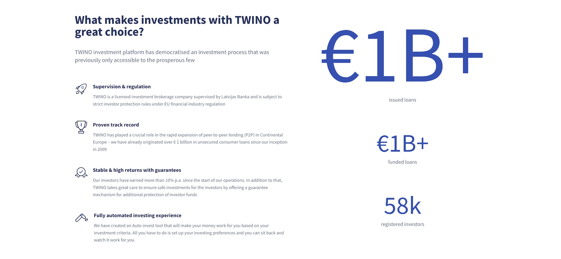 Twino is a Peer-to-Peer platform based in Latvia and is one of the largest Peer-to-Peer lending platform in Europe, with over 1 billion Euros worth of loans funded since the creation of the platform. They currently have over 20,000 investors. They also reached profitability back in 2018, which is a very good sign for a Peer-to-Peer lending platform.